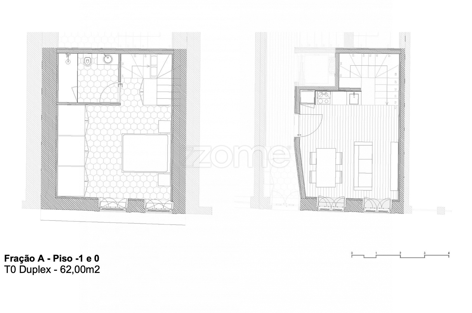 Apartamento T1  situado no R/C e -1º e  é composto por: